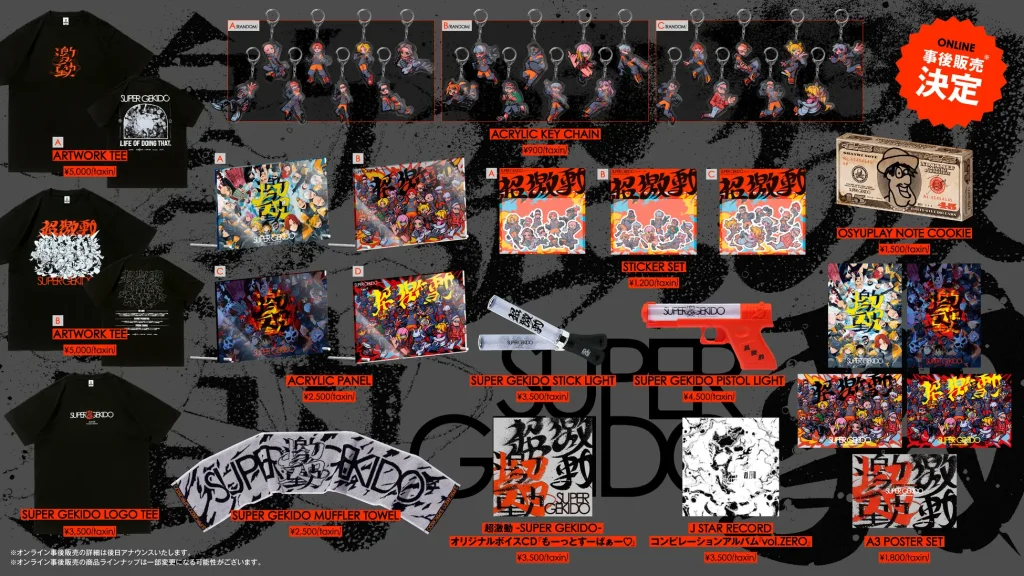 事前オンライン販売・現地物販ともにご好評をいただき、売り切れが続出した『超激動 -SUPER GEKIDO-』公式グッズを、皆さまからのご要望にお応えしオンラインにて事後販売いたします。